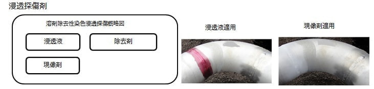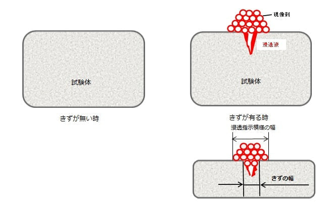 試験体表面に開口し内部に空間があるきず部に着色した液体や蛍光染色を含んだ液体を浸透させ,液体が発する色または蛍光を知覚し浸透指示模様を肉眼で識別します。